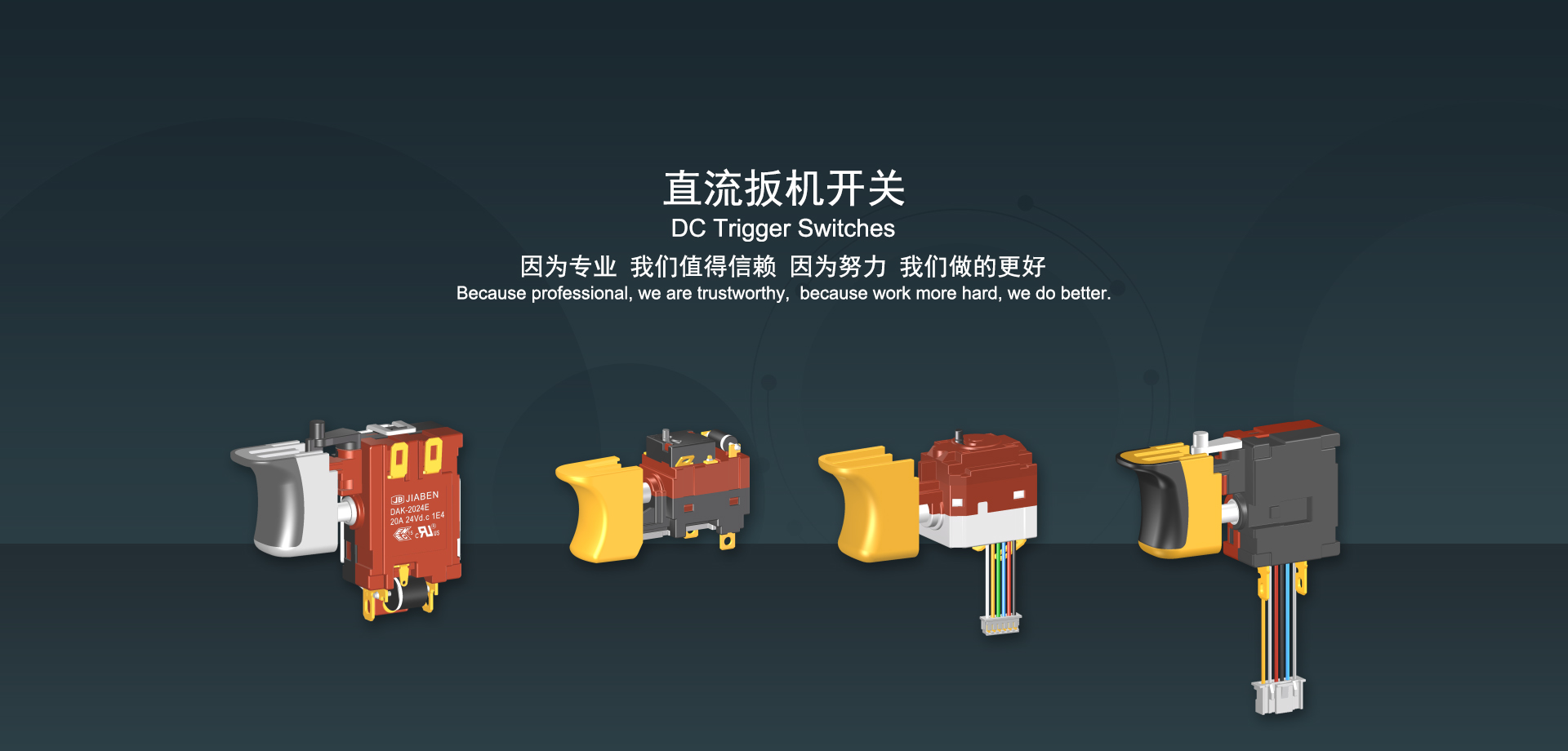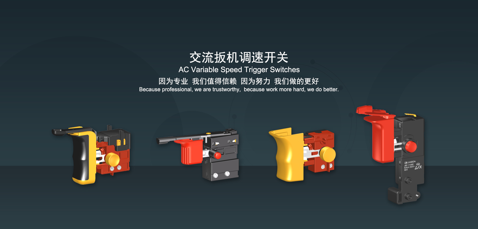 浙江佳奔電子有限公司始建于1986年,坐落于浙江省樂清市虹橋鎮(zhèn)東電子信息產(chǎn)業(yè)園內(nèi),現(xiàn)有職工700多人,資產(chǎn)總額超3億元。公司主要經(jīng)營“JIABEN”牌微動開關、蹺板開關、按鈕開關、扳機開關、調(diào)速開關和電位器開關等各類交、直流器具開關和各類交、直流線路板模塊等產(chǎn)品,主要應用于交、直流電動工具、電動園林工具、清潔器具、家用電器和小型機床等行業(yè),是集產(chǎn)品設計、研發(fā)、制造、銷售和服務于一體的國家高新技術企業(yè)。JIABEN was founded in 1986, located in East Electronic Information Industry Park, Hongqiao Town, Yueqing City, Zhejiang Proviance, existing staff more than 700 peoples, more than 300 million RMB worth of assets. Company is mainly engaged in "JIABEN" brand Micro Switch, Rocker Switch, Push-button Switch, Trigger Switch, Speed Regulating Switch, Potentiometer Switch and other kinds of appliance switch and all kinds of AC or DC circuit board module, such as more than 100 series, 8000 kinds of models of products, mainly used in AC or DC Power-tools, Power Gardening Tools, Cleaning Appliances, Household Appliances and Small Machine Tool and other industries, is the collection product design, research and development, manufacturing, sales and service in one of the national high and new technology enterprise.